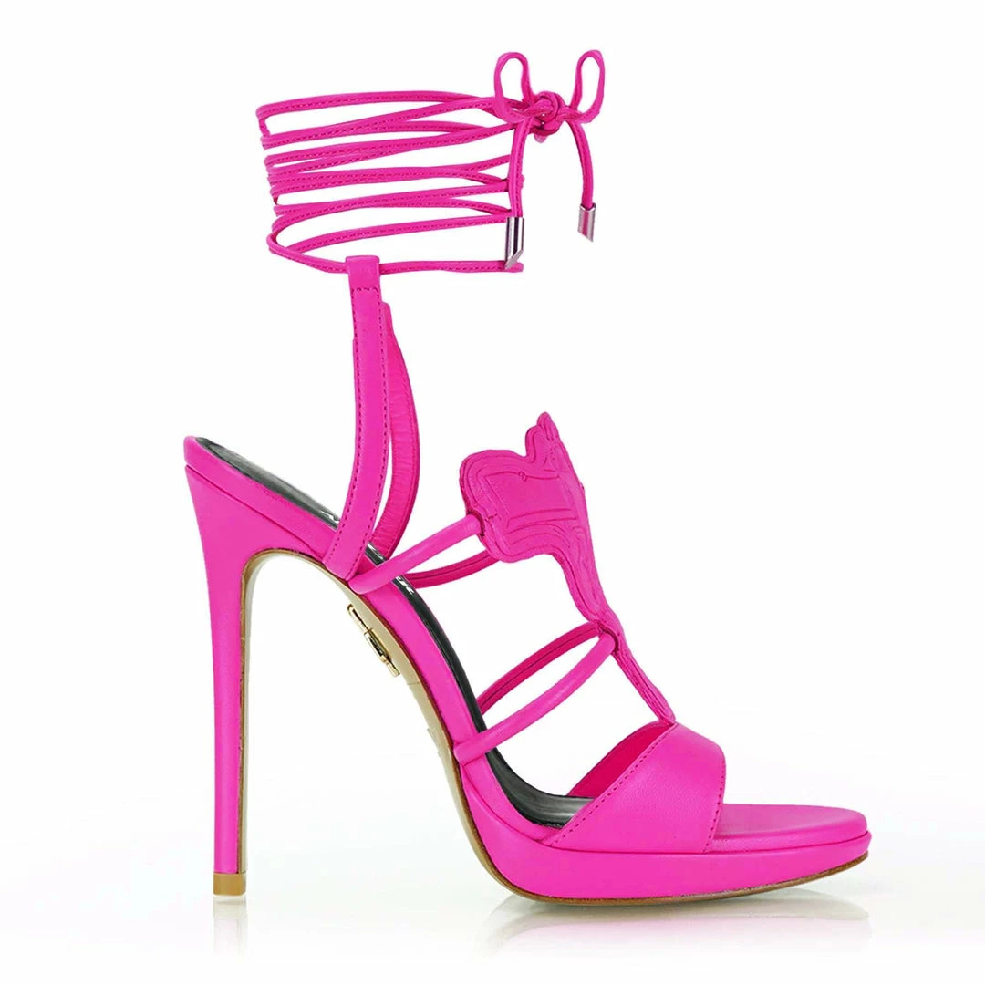 An all-pink sandal with a bold and urban touch. In this pair crafted out pink nappa leather you feel strength through the silhouette, the 100mm heel, but specifically through the symbolic gun that gently lies on the forefoot. In these heels, you feel instantly powerful.
