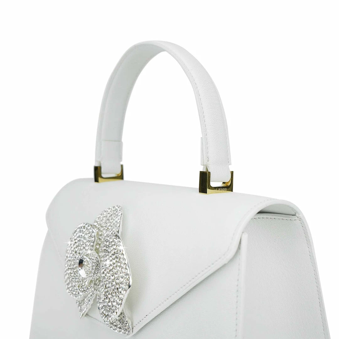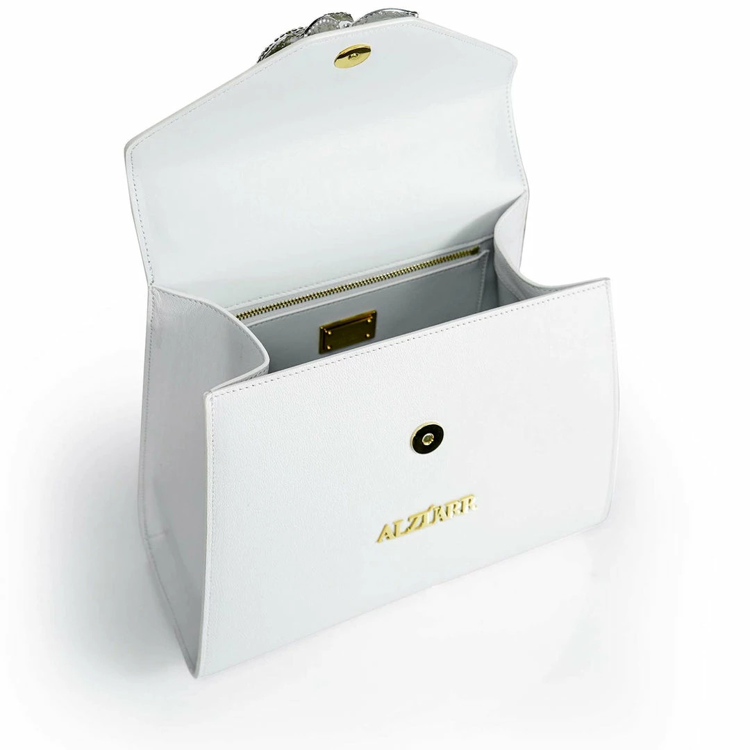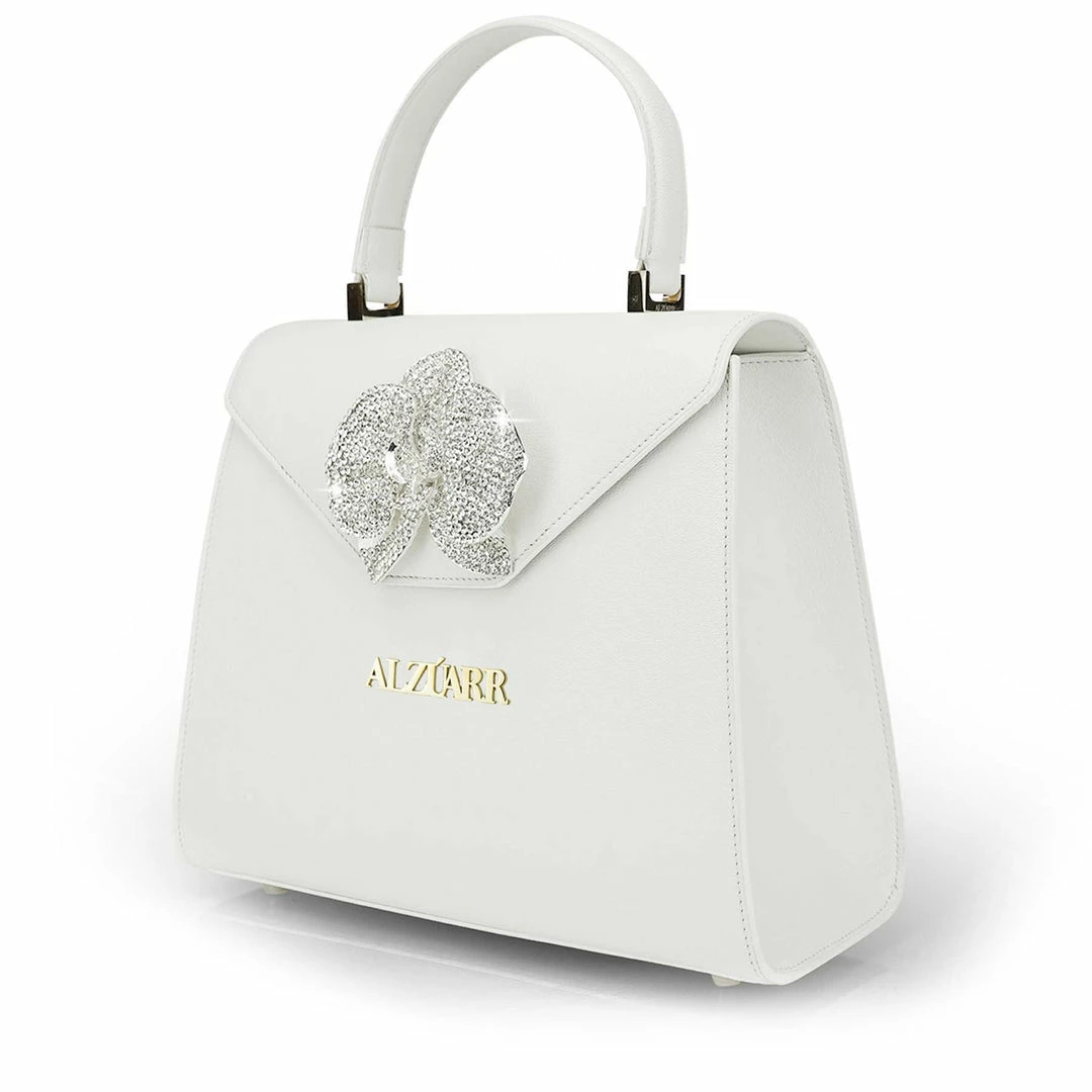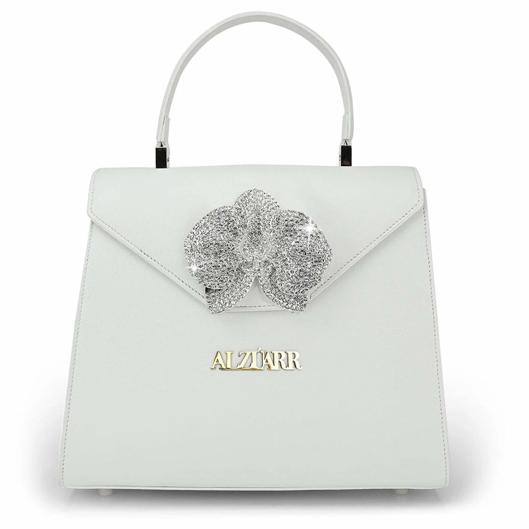 Timeless and chic, the Gyall bag has that timeless design, where it still has an eye-catching effect through the signature light-catching orchid that is placed at the opening. The Orchid is inspired by the mother of designer Zeynep Dag and has Crystals on them. The bag is crafted from white Nappa leather and has gold hardware with the Alzúarr logo for that extra detail. The Gyall is the perfect accessory for every occasion.