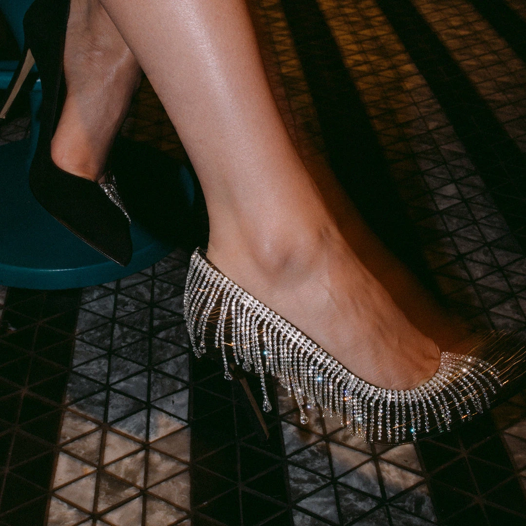 In soft black suede, The Merci is the sophisticated pump that will blow everyone away. The pair is detailed with a string of 1038 light-catching crystals that are added on both outer sides and will definitely spark your movement. For a stylish look, the shoe is shaped with a pointed toe that complements the 100mm heel wonderfully. Wear your outfit with these heels and you are sure to make a great impression. The Merci shoe is handmade in Italy from the finest suede.