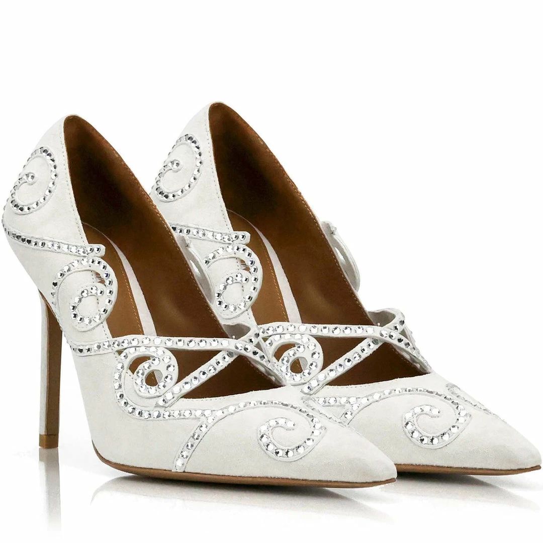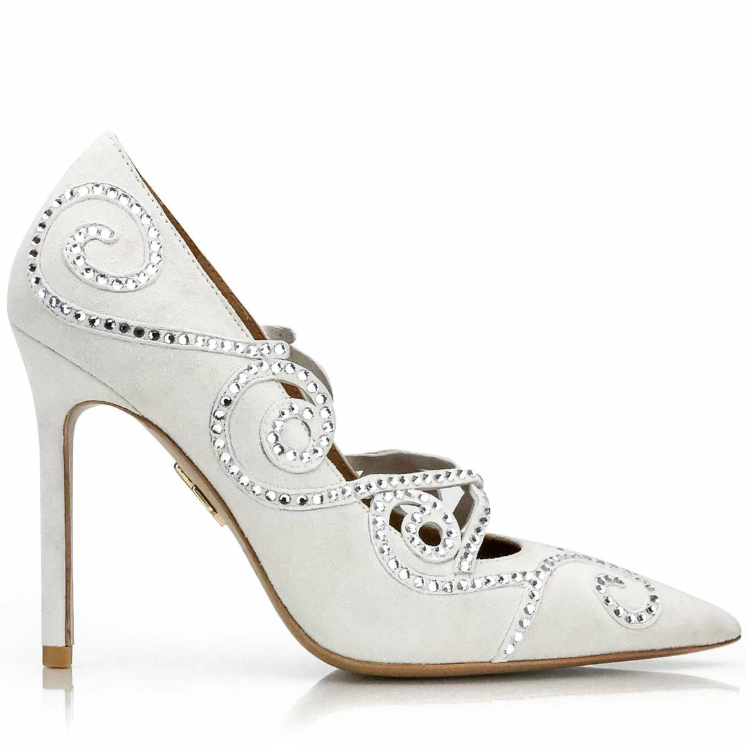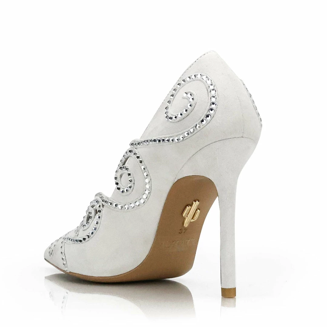 Day or Night this exquisite white suede modern pump will be an eye-catcher. This pair has thin elegant moving straps around and across the shoes. The straps are covered in 328 crystals that have been placed one by one by our Italian craftsmen. These crystals give the modern 100mm high heel pump that extra extravagant effect.