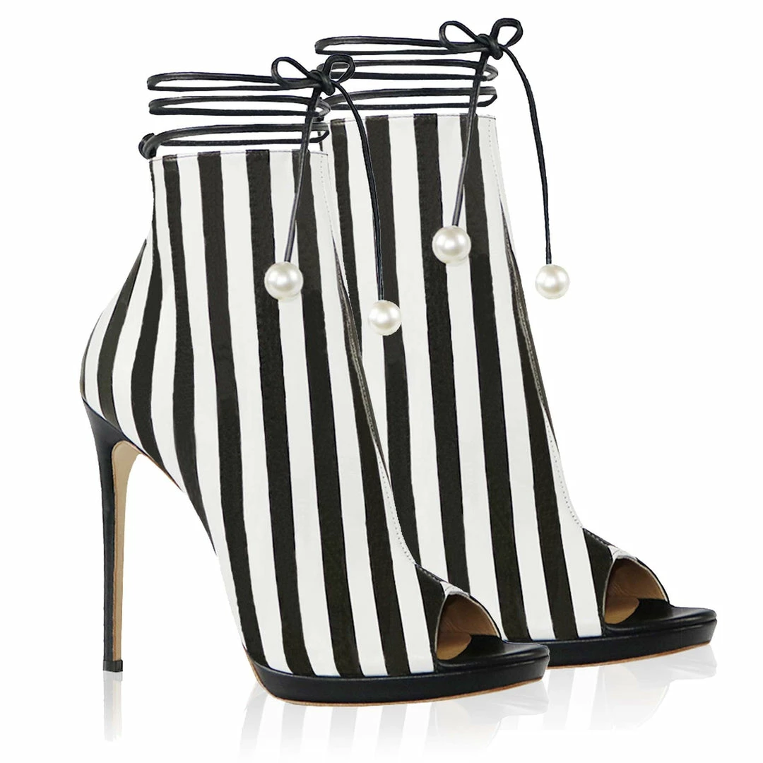 Playful yet bold, with these shoes you will make an entrance. The Kissler is crafted by our Italian craftsmen out of the best leather and printed in a black and white striped pattern. The silhouette is elegant but still powerful because of de secure fit, ankle straps, open toe and the pearls that finish the straps. The 120mm high boots are a real power boots.