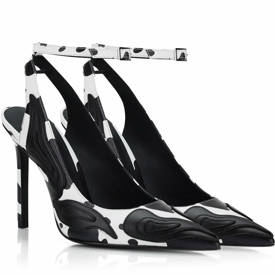 The black and white Nappa leather makes it easy to combine with your wardrobe. The Lala is inspired by the fur of the cow. The black spots have been stitched several times by our Italian craftsmen, creating a unique 3D effect, never seen before. This pair is a statement 100mm high pump that will be perfect under every outfit.