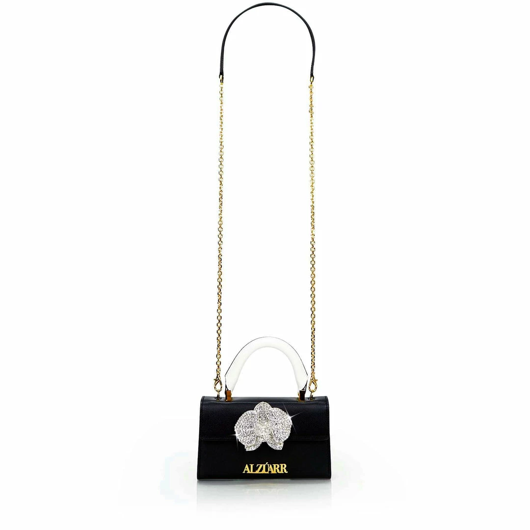 Modern and chic, the Larr bag is Italian-crafted in black and white Nappa leather and is part of the orchid collection. The Bag characterizes itself by the light-catching signature crystals orchid. The Larr bag will shine for you in your day-to-night looks.