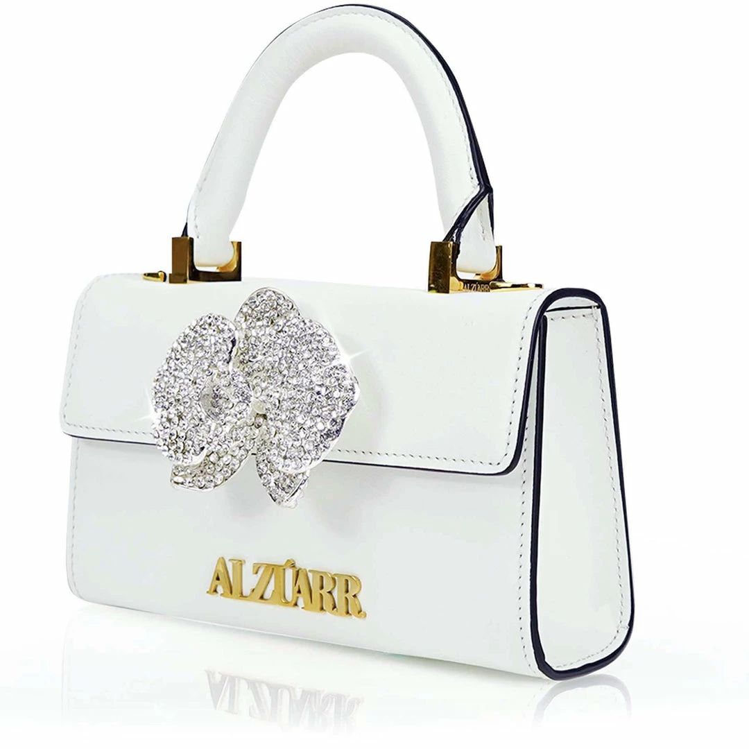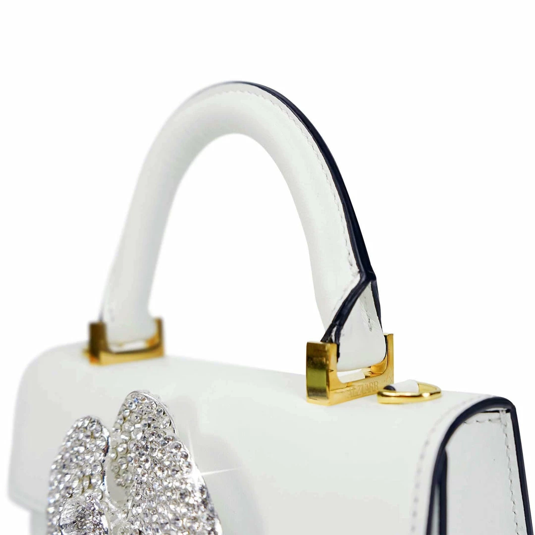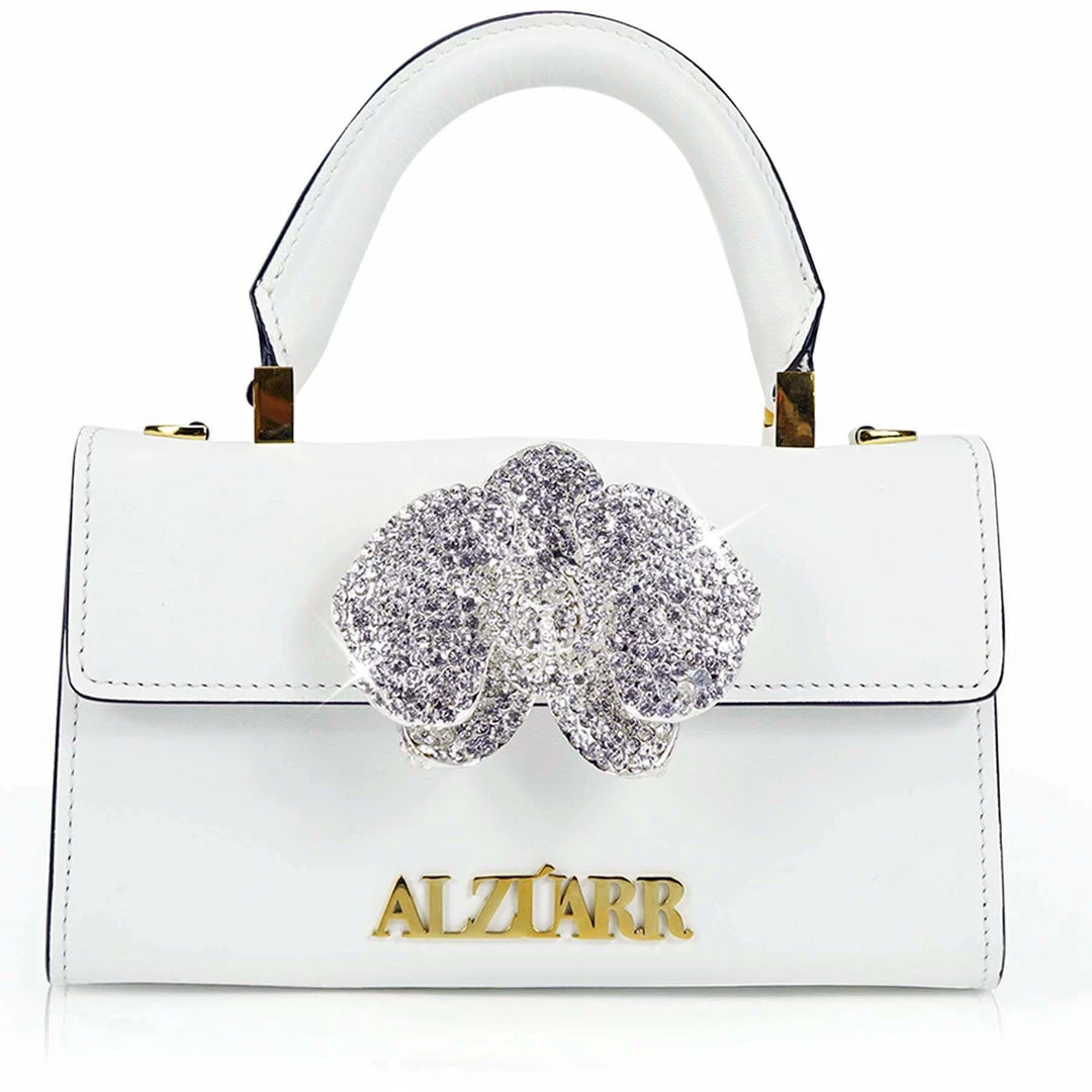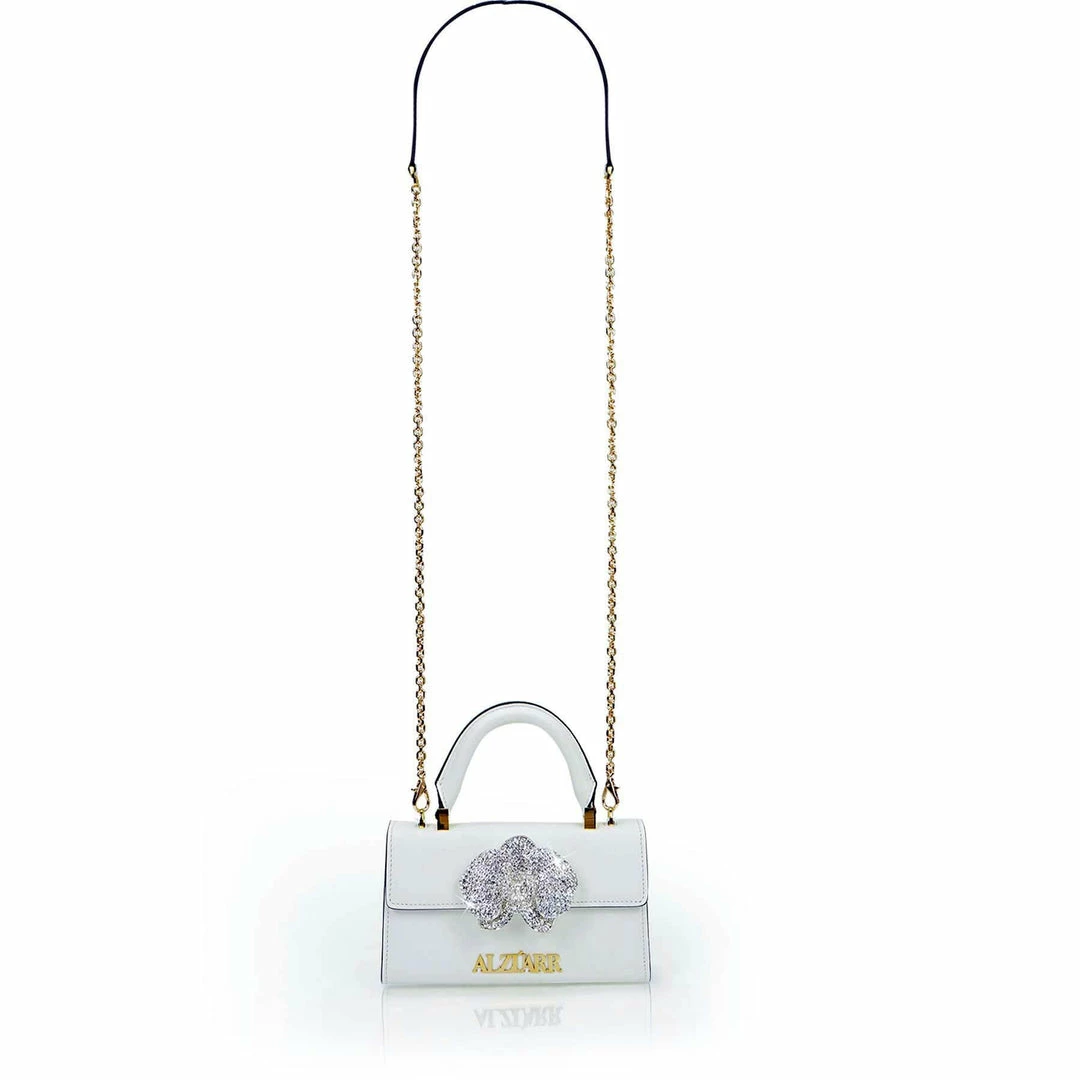 Modern and chic, the Larr bag is Italian-crafted in white Nappa leather and is part of the orchid collection. The Bag characterizes itself by the light-catching signature crystal orchid. The Larr bag will shine for you in your day-to-night looks.