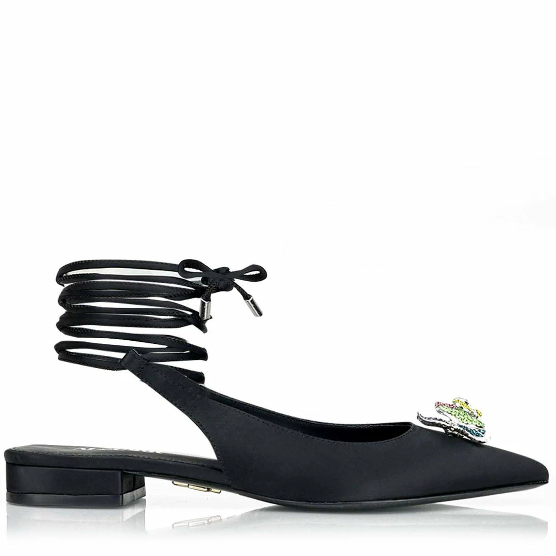 Our Classic Lial flat is crafted from black satin and has straps that can be wrapped around the ankle for that elegant yet romantic look. At the front, this flat has Alzúarr it’s signature orchid covered with crystals in green, purple, blue and yellow. The open back provides a comfortable fit and makes this your day-to-day shoe.