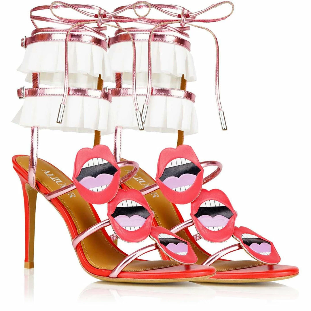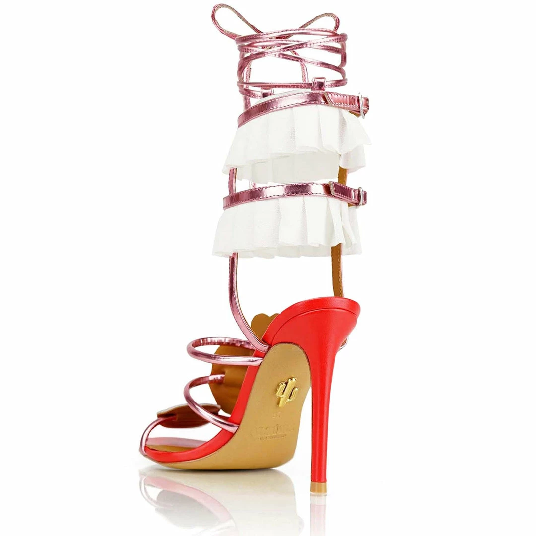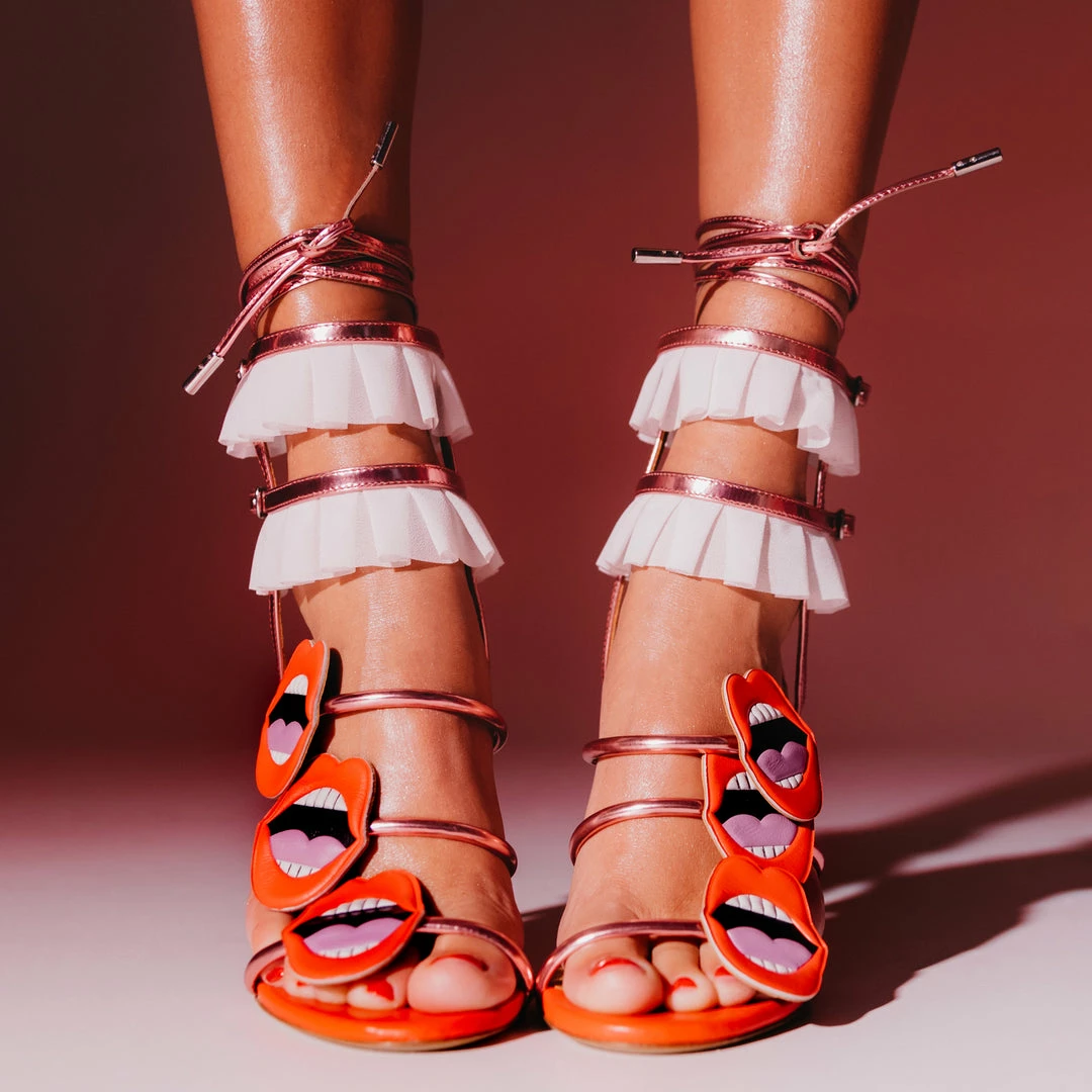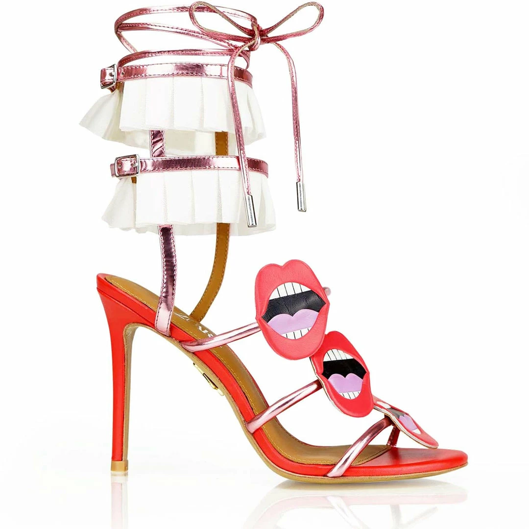 The Lora Must Have heels are one of a kind. This pair is daring and distinct and has specific details that give the shoe its uniqueness. Various materials are used, such as red leather, pink metallic leather, and fabric ruffles. These ruffles are used to extend the elegant silhouette at the top and give you a more feminine look. The craftsmanship has an eye for detail and placed handmade red lips on the side of the shoe. These finish the shoe in such a way that everyone will be talking about your shoes.