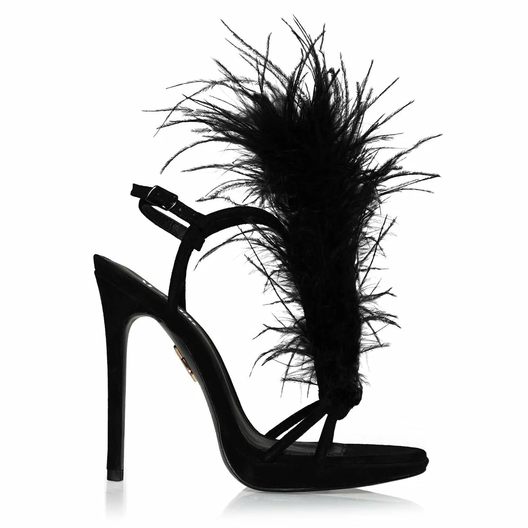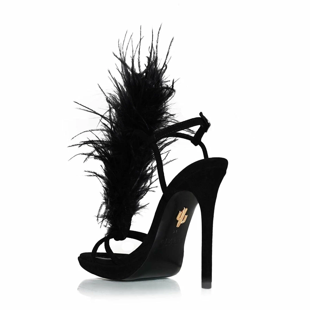 The extra soft black ostrich feathers give The Murla a bold and extravagant look. The feathers move delicate up the front of the foot, making them visible from all sides. No one will miss them. The extravagant look is further enhanced by black soft suede and a 120mm heel balanced by a small platform. The heels are here to make you shine.