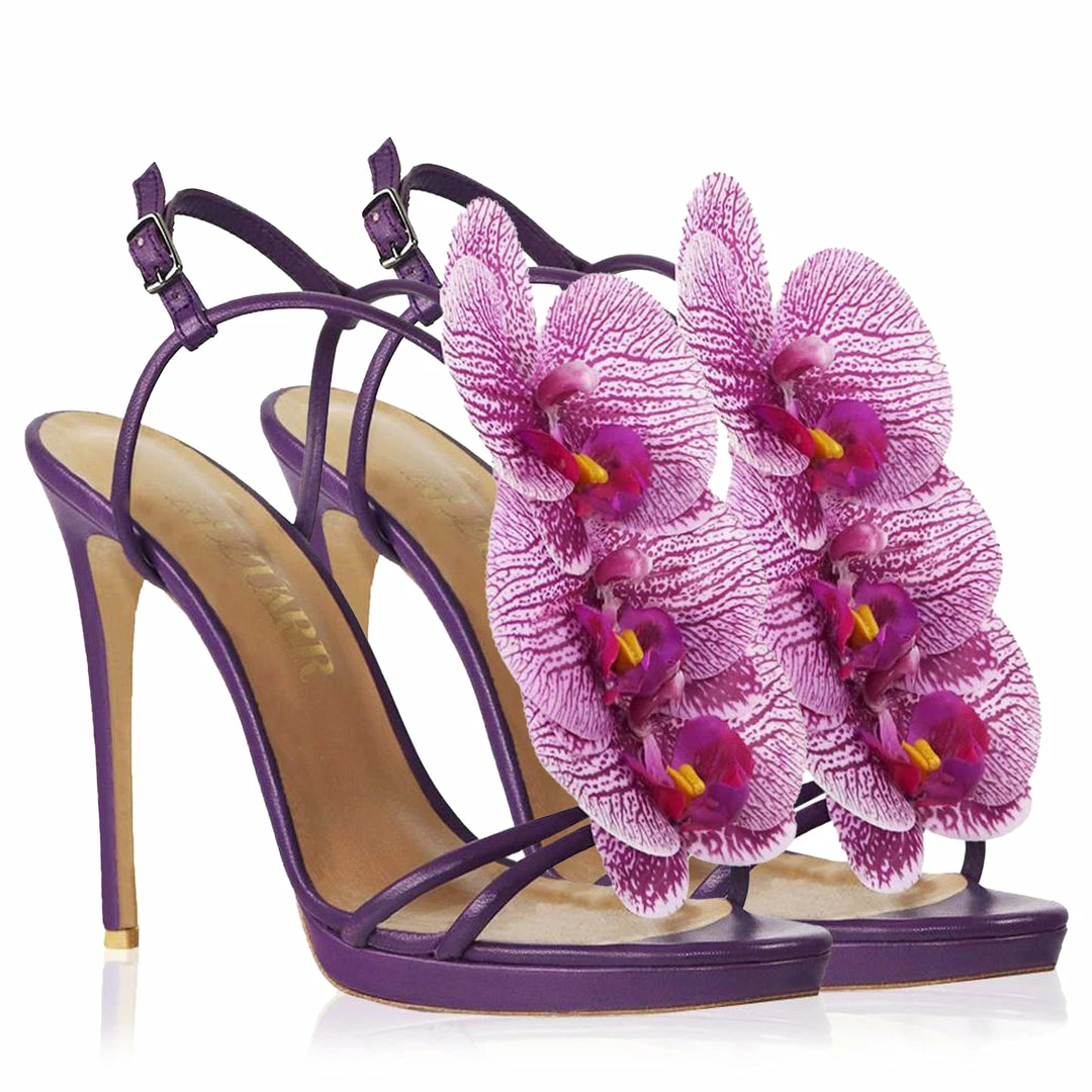 The Pretty Venus Black is crafted in Italy from purple Nappa leather and belongs to Alzúarr’s signature orchid collection that is inspired by the mother of designer Zeynep Dag her favorite flower. This pair has three purple signature orchids placed on the top of the foot that gives The Pretty Venus a romantic and classic silhouette. This silhouette is further enhanced by a 120 mm heel that is balanced by a small platform.