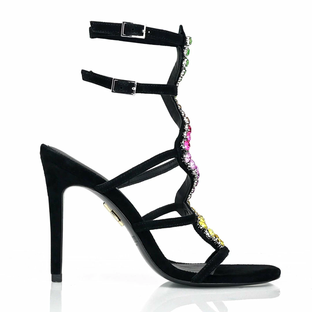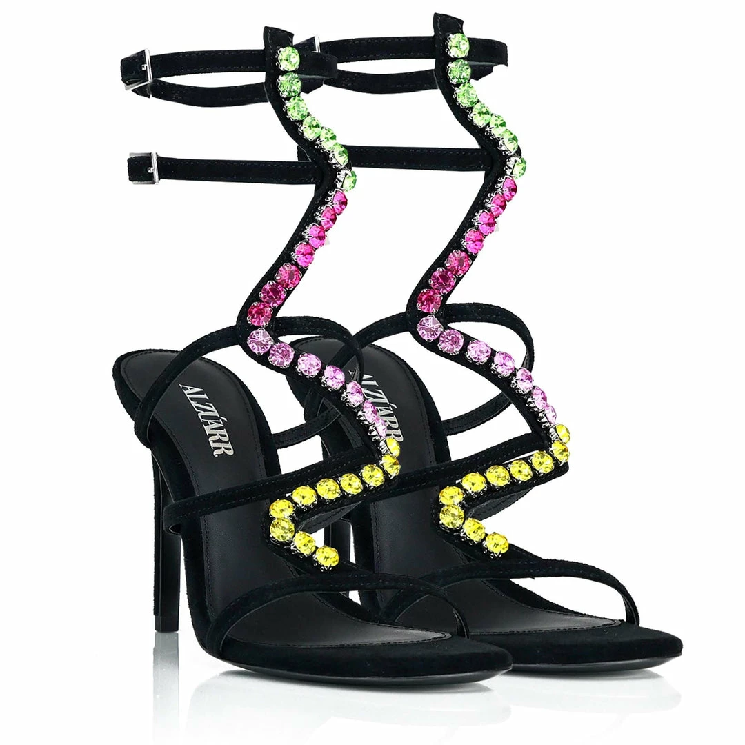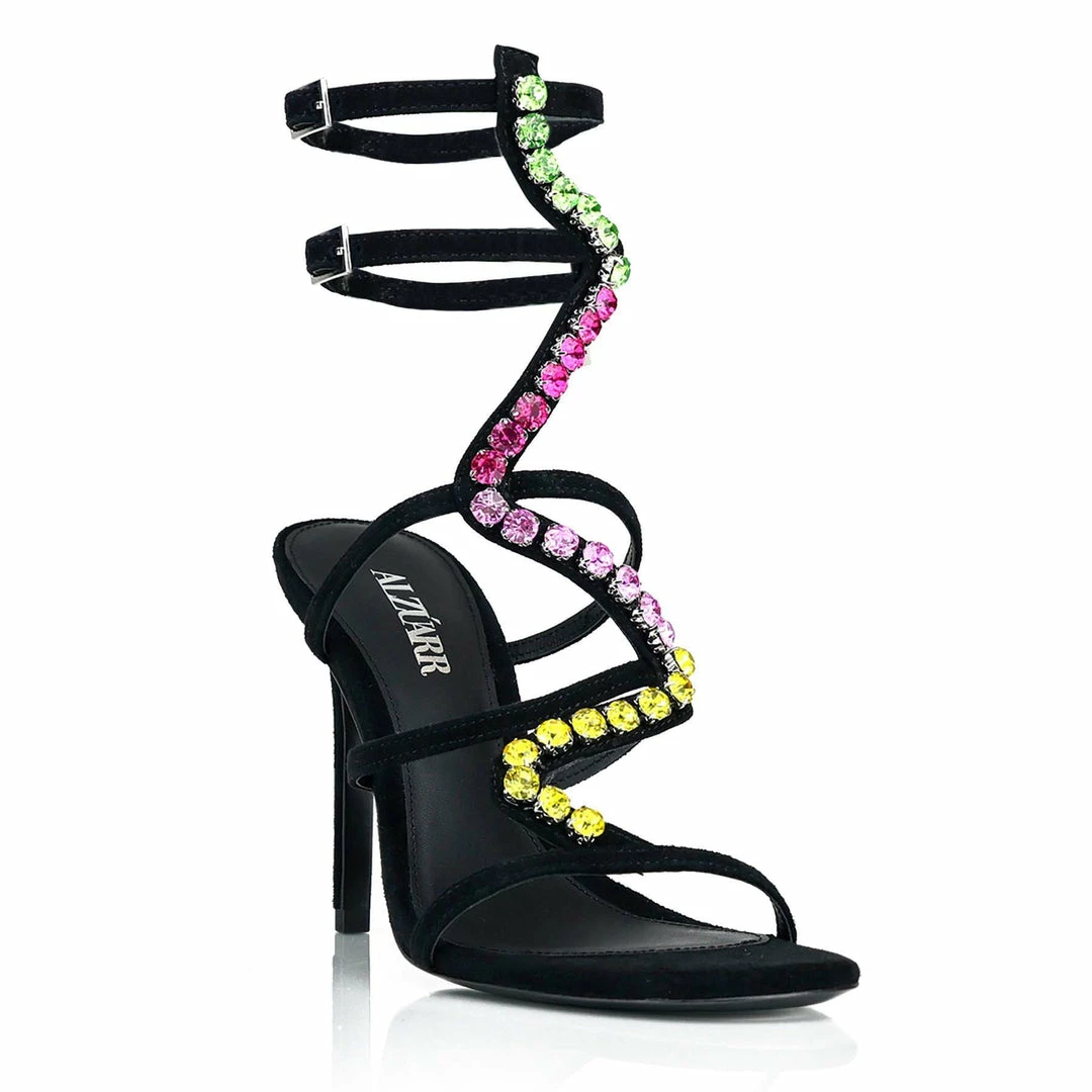 The storm has a blend between chic, bold and elegant. Our Italian craftsman crafted it in black calfskin suede and is set under a 100mm heel. This pair characterizes itself by the wavy snake movement strap at the front of the foot that is bedazzled in multicolored stones. The silhouette gives the elegant and the stones bring a bolder look. This way you can were these on multiple occasions.