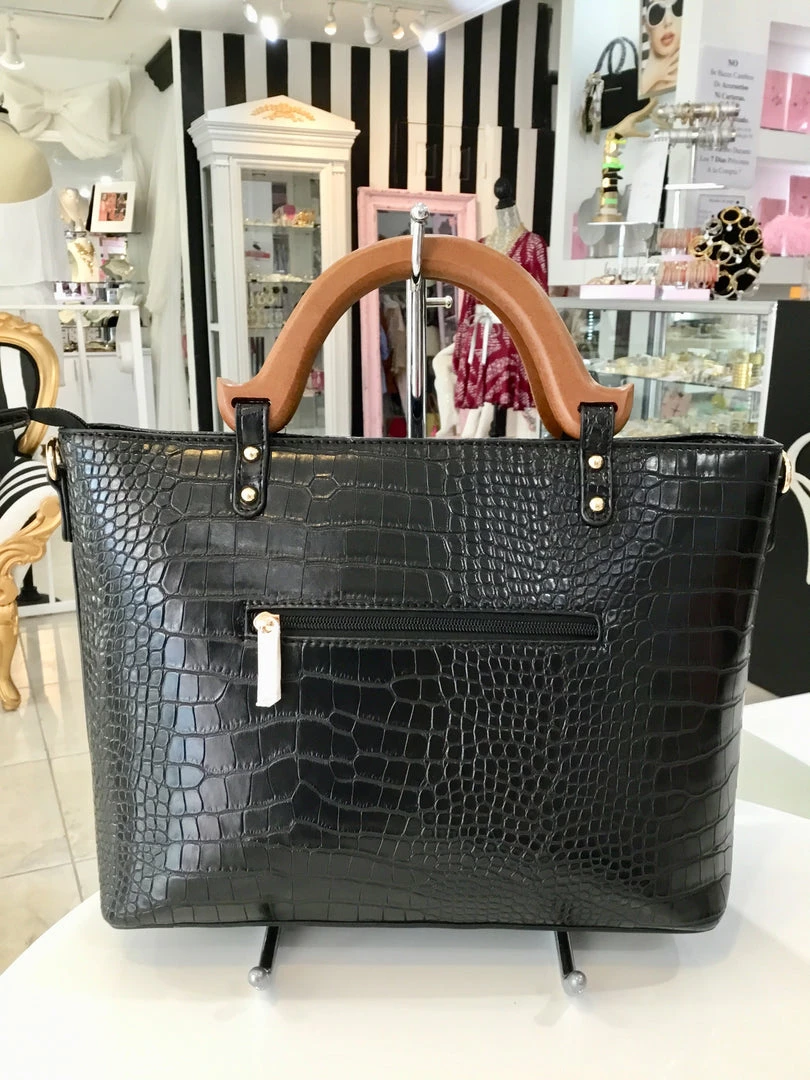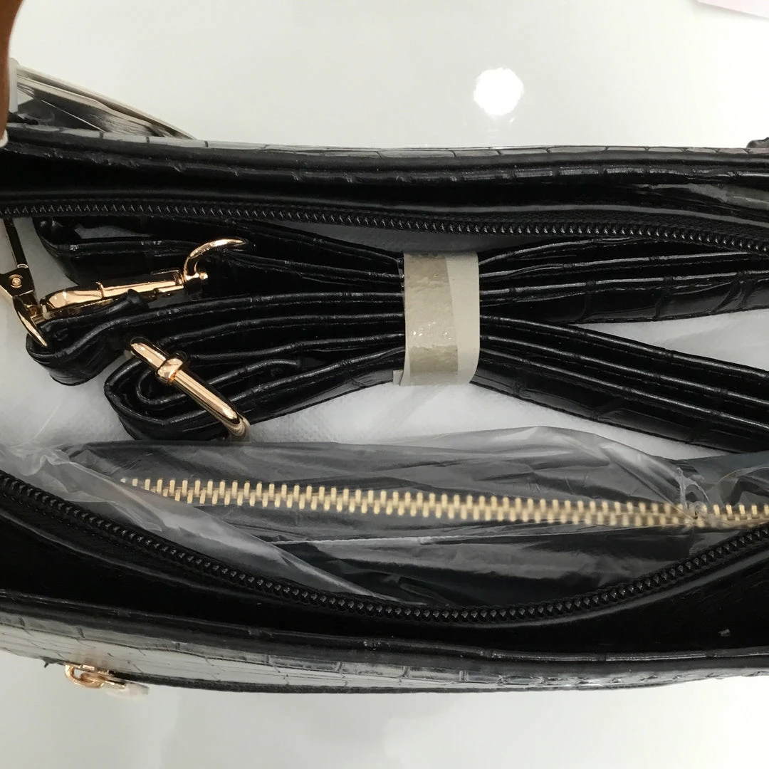 Black handbag with a black wallet inside: Height 4”, Width 0.5”, Long 8”