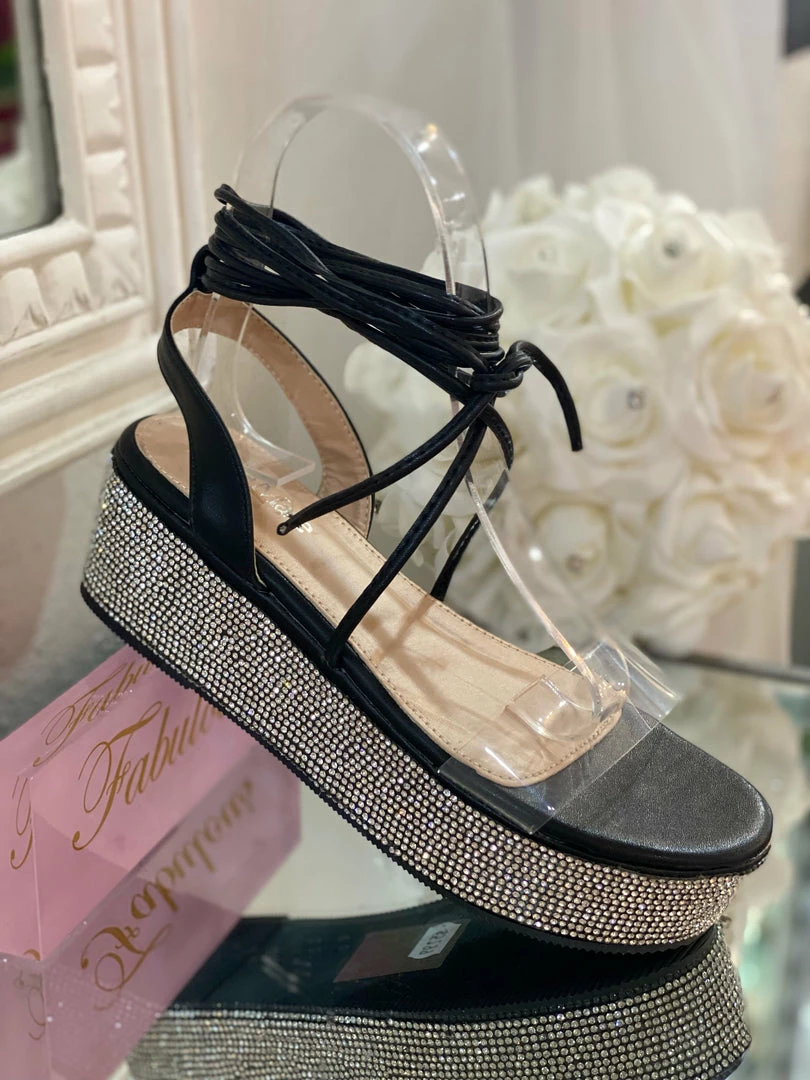 Fabulous Shoes Sparkly Black Platform Lace Up Sandals WEDGES & PLATFORMS